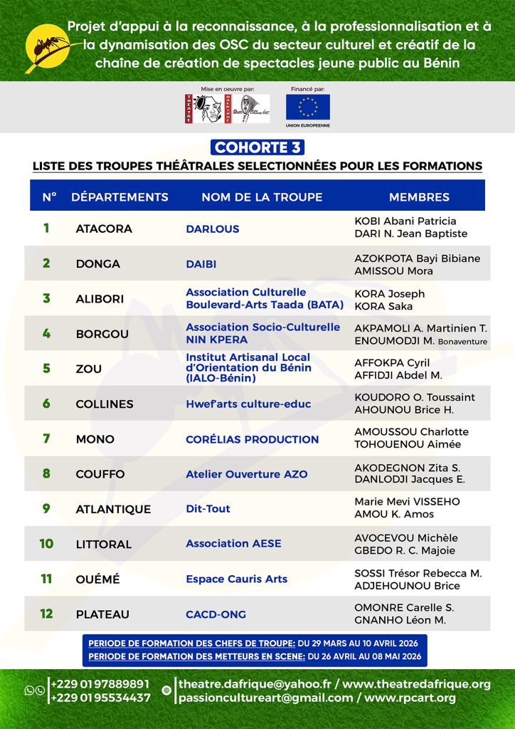 Résultats Appel à candidature en faveur des troupes théâtrales. Cohorte 3 du Projet d’appui à la reconnaissance, à la professionnalisation et à la dynamisation des OSC du secteur culturel et créatif de la chaîne de création de spectacle jeune public au Bénin. Projet mis en œuvre par les associations Théâtre d’Afrique et Passion Culture Art, sur financement de l’Union européenne au Bénin.